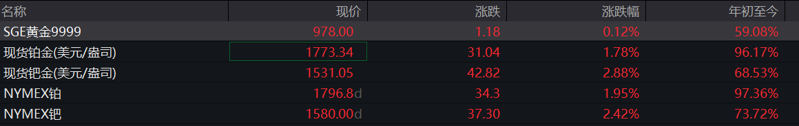 事实上,今年以来,有色金属板块持续成为资本市场焦点,贵金属与工业金属价格集体走强:黄金、白银、铜价纷纷迎来显著上涨,其中铜价近期突破历史峰值,白银短期内涨幅超 20%。而铂钯则低调发力,Wind数据显示,NYMEX铂今年以来累计涨幅已达97%,NYMEX钯的涨幅也超过73%,远超同时期COMEX黄金期货的涨幅65%。