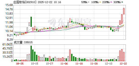 庄园牧场盘中涨停,已连收4个涨停板,截至9:36,该股报15.02元,换手率19.19%,成交量3282.12万股,成交金额4.81亿元,涨停板封单金额为5.37亿元。连续涨停期间,该股累计上涨46.54%,累计换手率为77.33%。最新A股总市值达29.37亿元,A股流通市值25.69亿元。